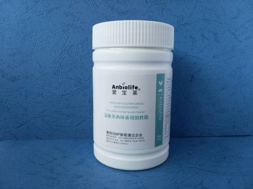 【藥理作用】四環(huán)素類抗生素。多西環(huán)素通過可逆性地與細(xì)菌核糖體30S亞基上的受體結(jié)合,干擾tRNA與mRNA形成核糖體復(fù)合物,阻止肽鏈延長而抑制蛋白質(zhì)合成,從而使細(xì)菌的生長繁殖迅速被抑制,多西環(huán)素對革蘭氏陽性菌和陰性菌均有抑制作用。細(xì)菌對多西霉素和土霉素存在交叉耐藥性。